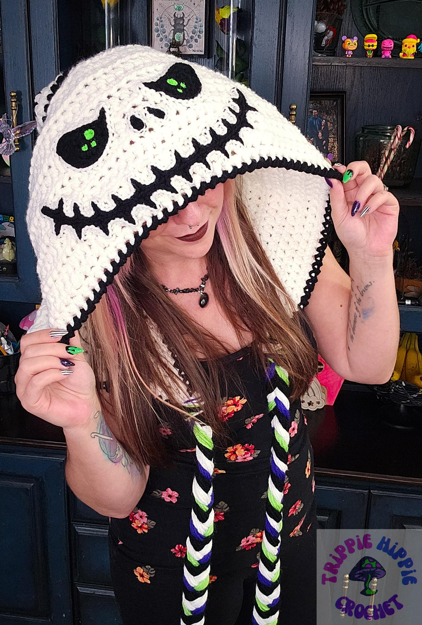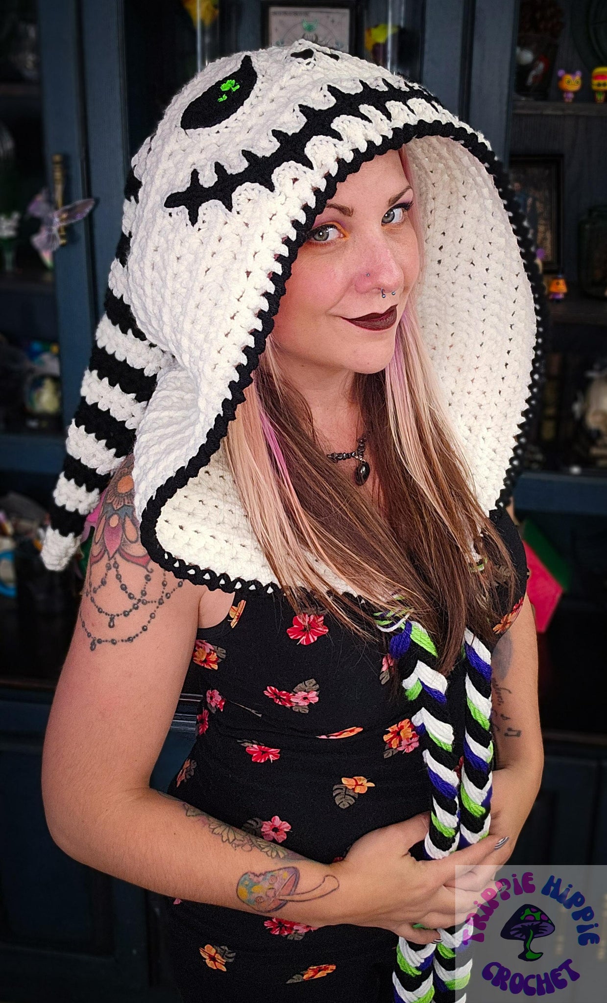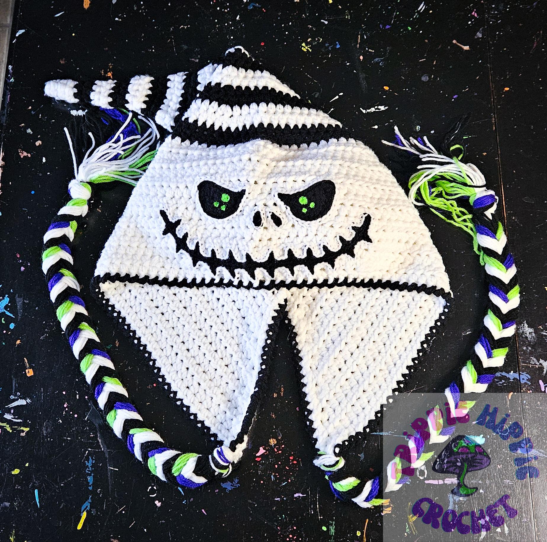 Who doesn't love this classic Jack hood?! This cozy hood is perfectly Oversized, and features a black and white striped "tail". Finishing it off are black, white, purple, and green braided ties.