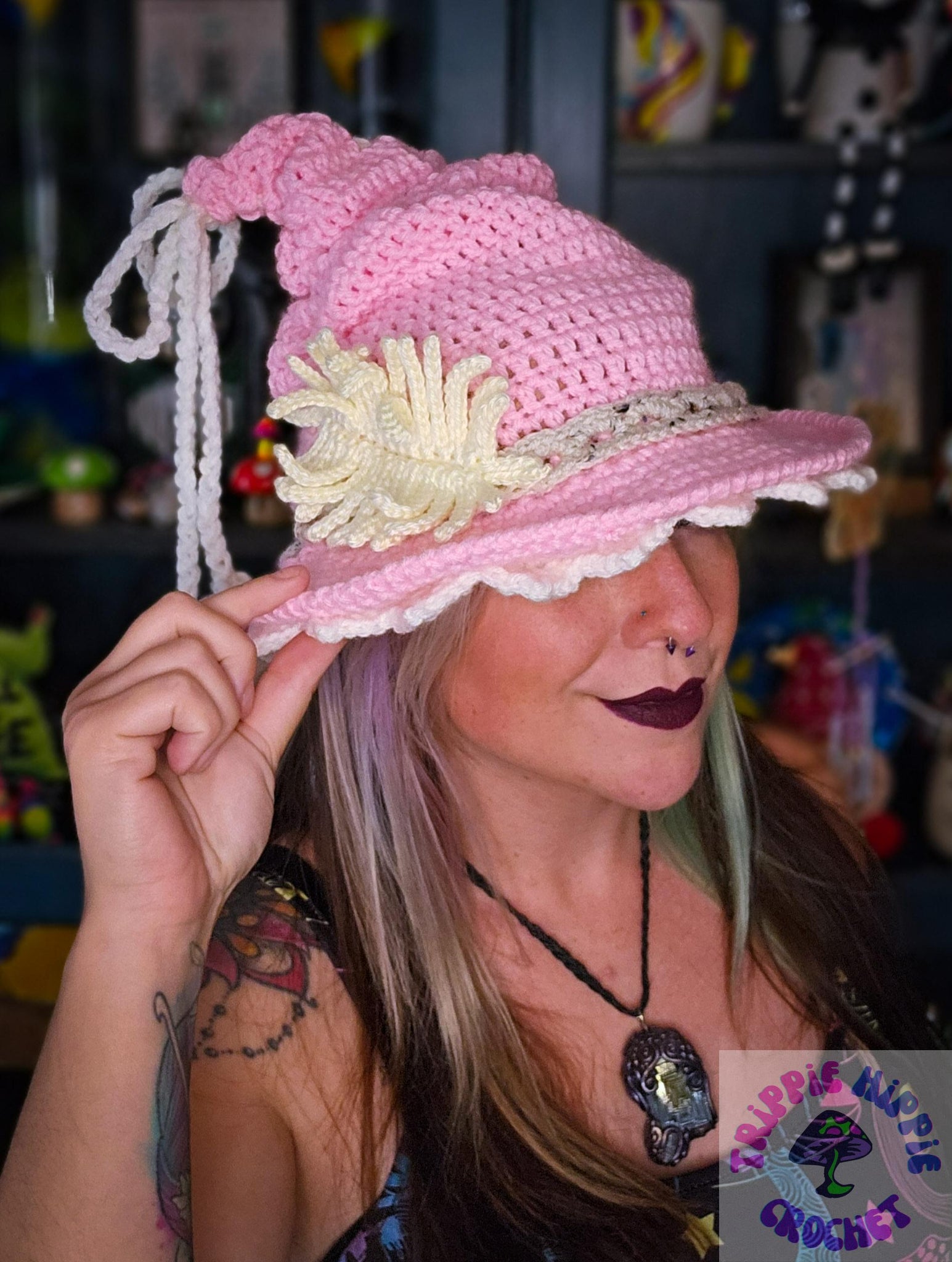 Be cozy and cute in this year's round of witch hats! All of them feature a short brim, with a lacy under ruffle, and a slouchy, bent witchy point tip, that utilizes drawstrings to achieve its shape. To finish off, they are decorated with a crochet ostrich feather.