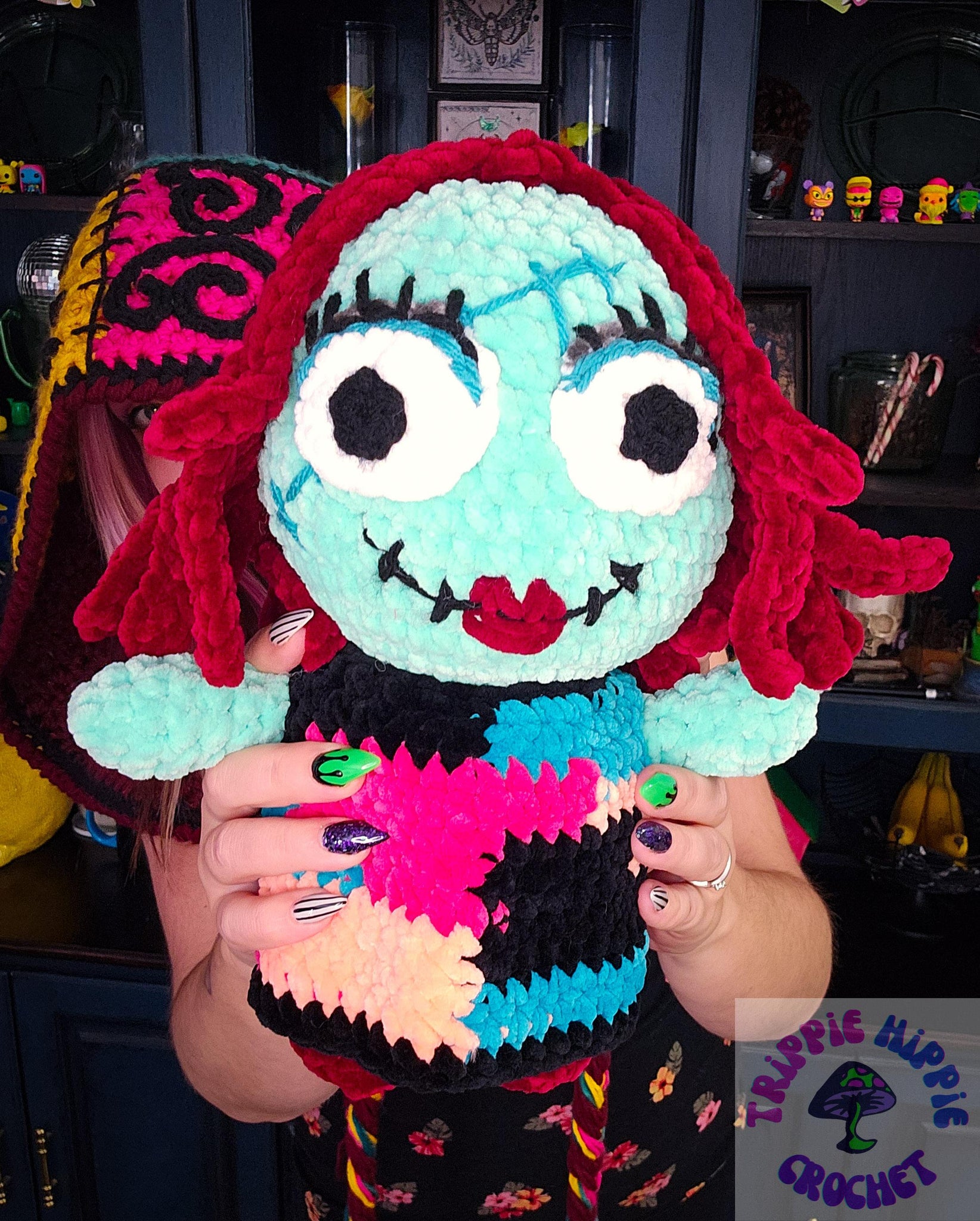 Isn't she adorable? Made to match Jack, this Sally is done up in the softest chenille yarn. Standing at about 12inches tall, she features her iconic hair, face stitches, and of course her patchwork dress.
