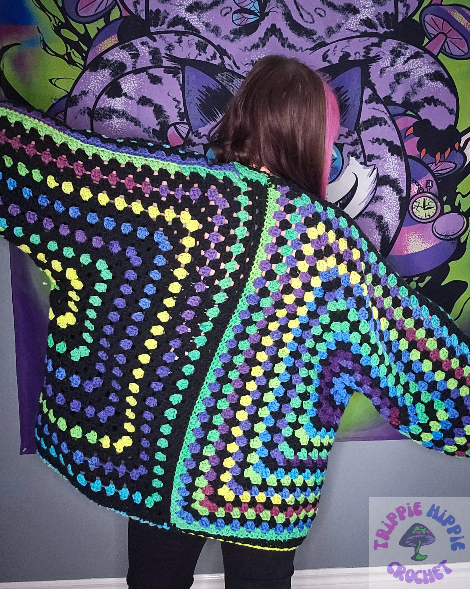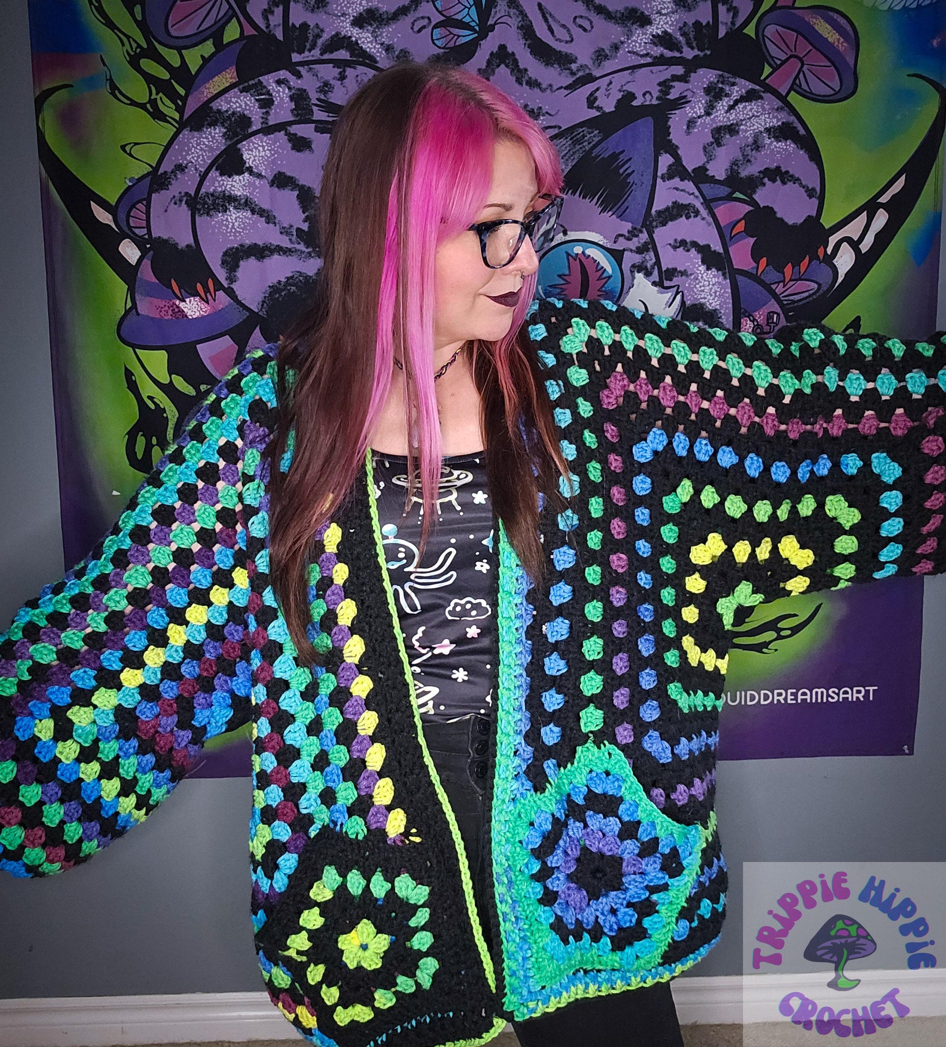 This comfy cardi is done up in shades of green, blue, purple, yellow, and black. It is done in a split style, where one side has more colorful stripes, and the other one is more black heavy. Finishing it off are 2 pockets on the front.