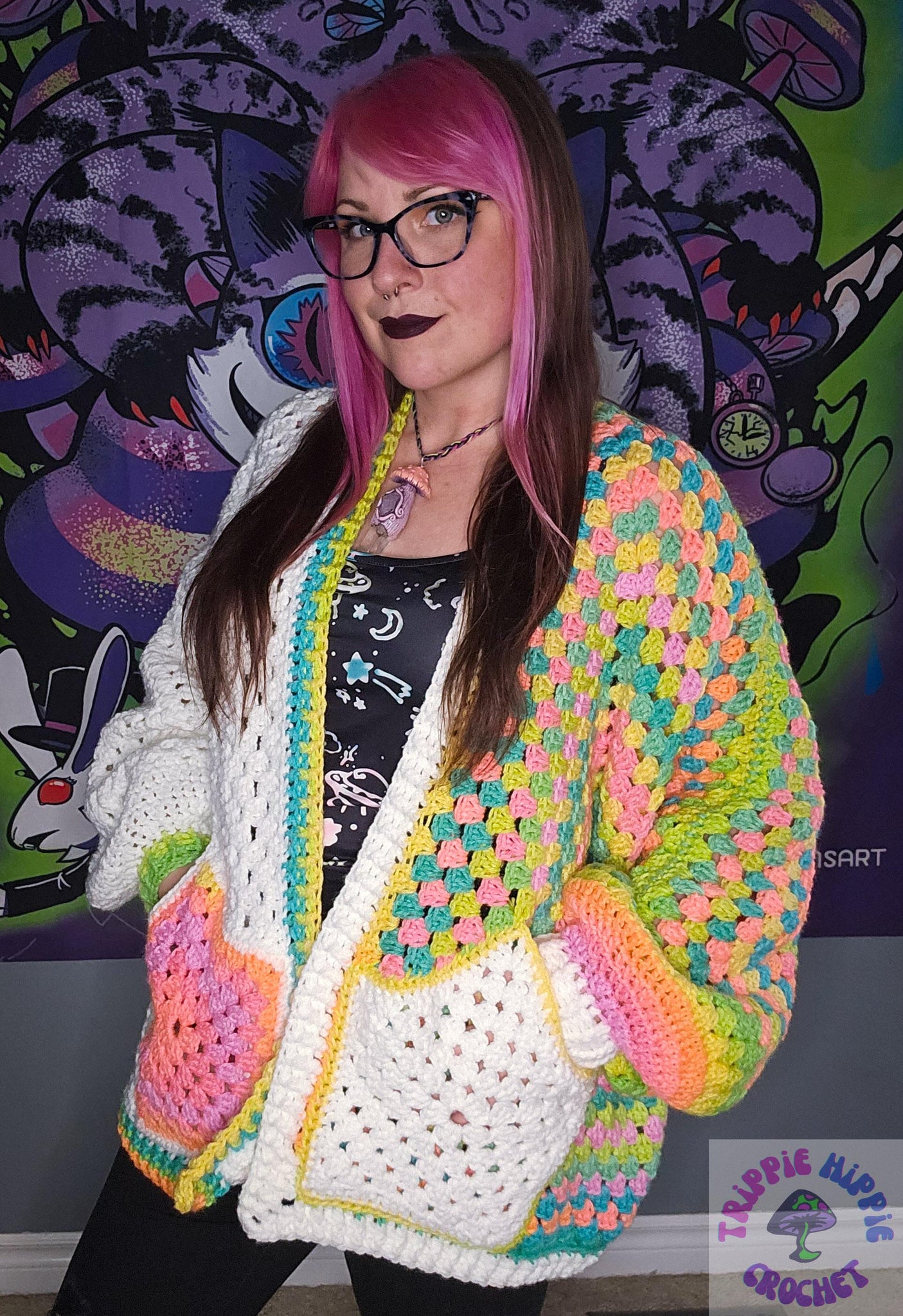 This beautiful cardi is done up in neon tones of yellow, green, orange, and pink, as well as white. It is split so that half is neon and half is white, and each side has the opposite colors for the pockets.