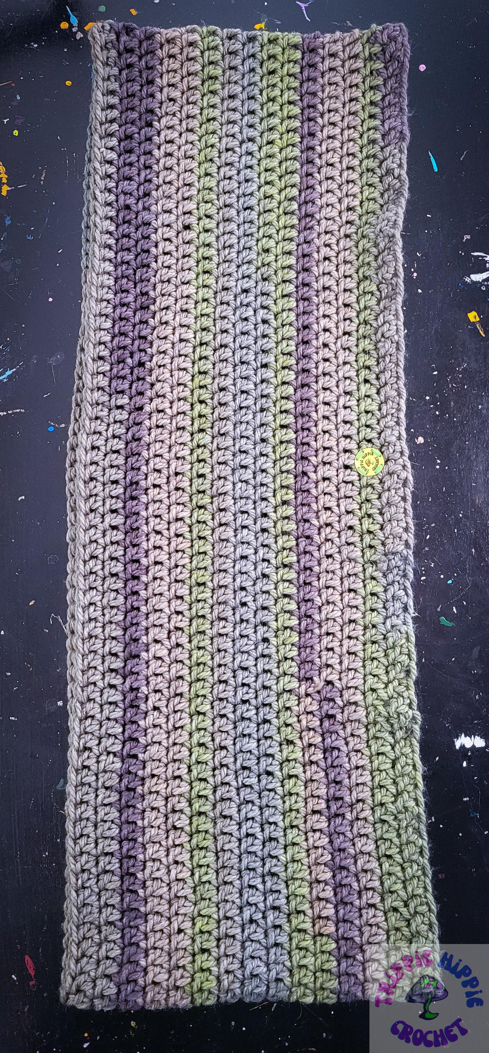 Cozy up with this super soft snood! What is a snood? An infinity scarf you can also wear as a hood, inspired by the Wednesday Addams show. This one is done up in tones of green, grey, and brown. It measures 64" around and 11" wide.