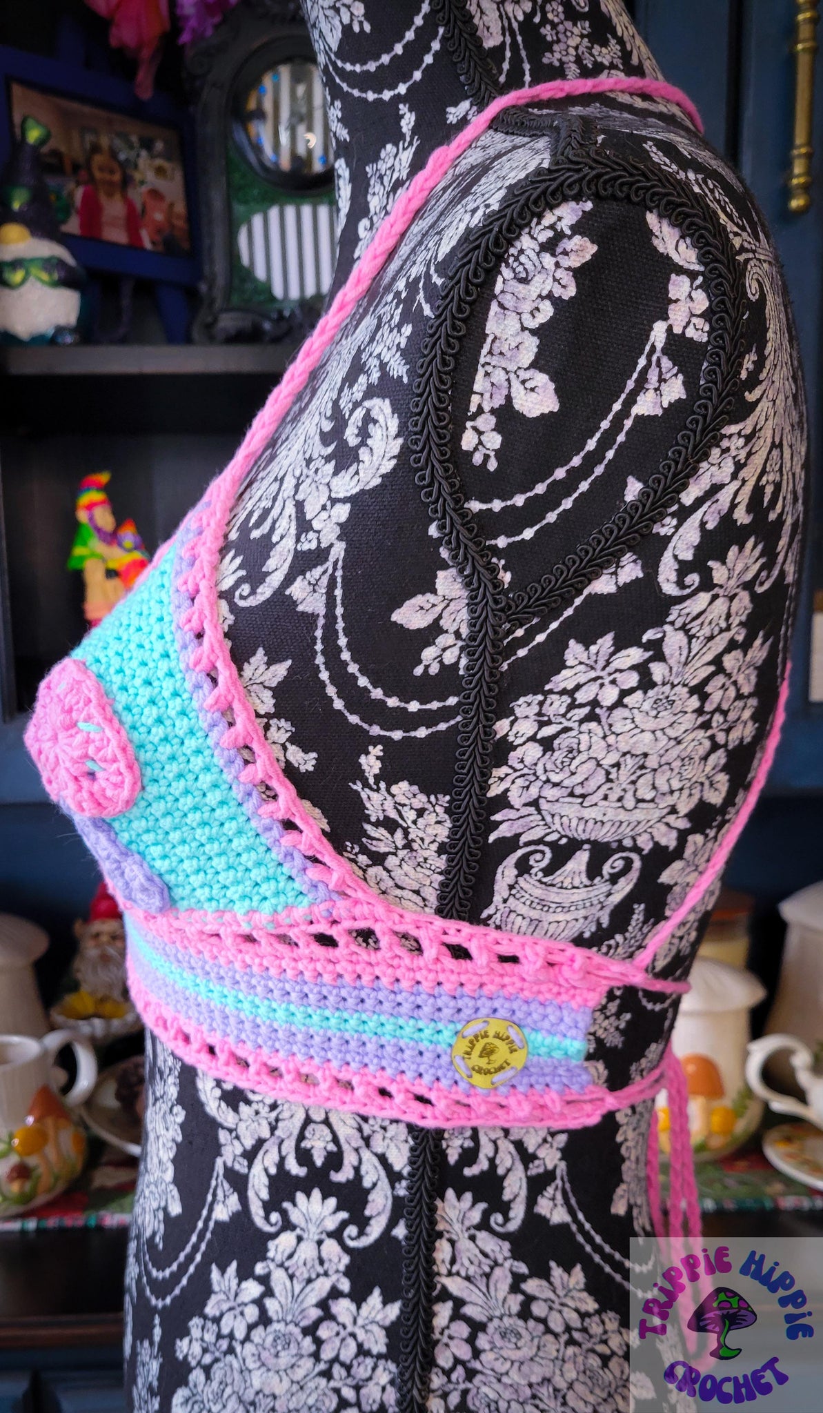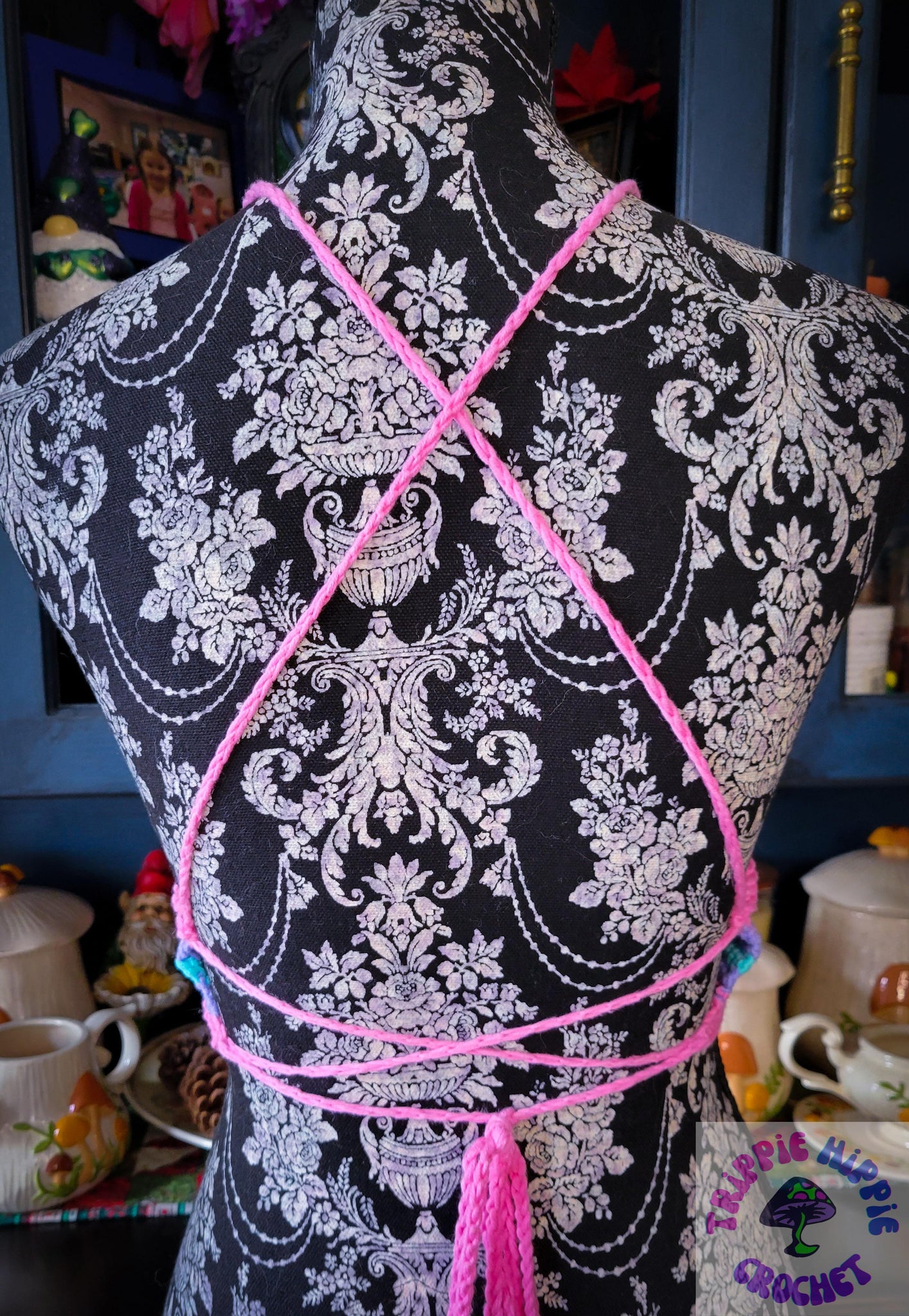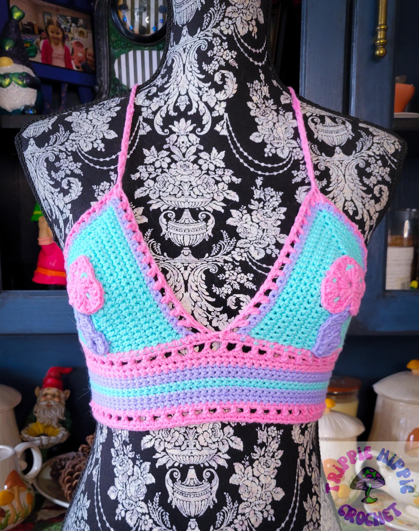 This cute summer top is done up in pastel green, pink, and purple, with matching mushrooms on the boobies! It is backless, featuring a cris-cross tie up back. The strings are extra long, feel free to tie off and cut where you feel appropriate once you've decided how long you need them.